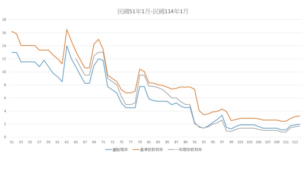 可以看出,基準放款利率在早期高達16%以上,之後逐步下降,近年則維持在2%左右的低檔。
